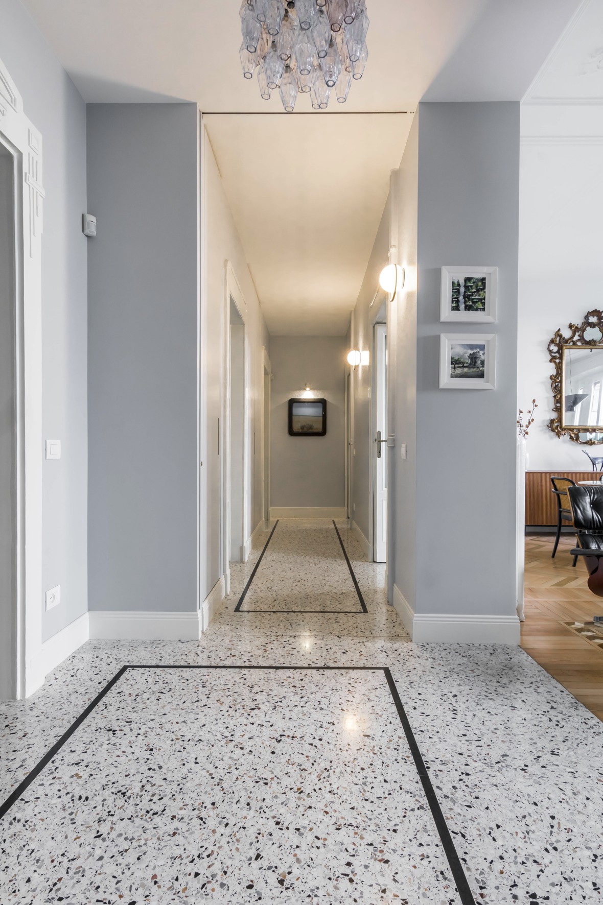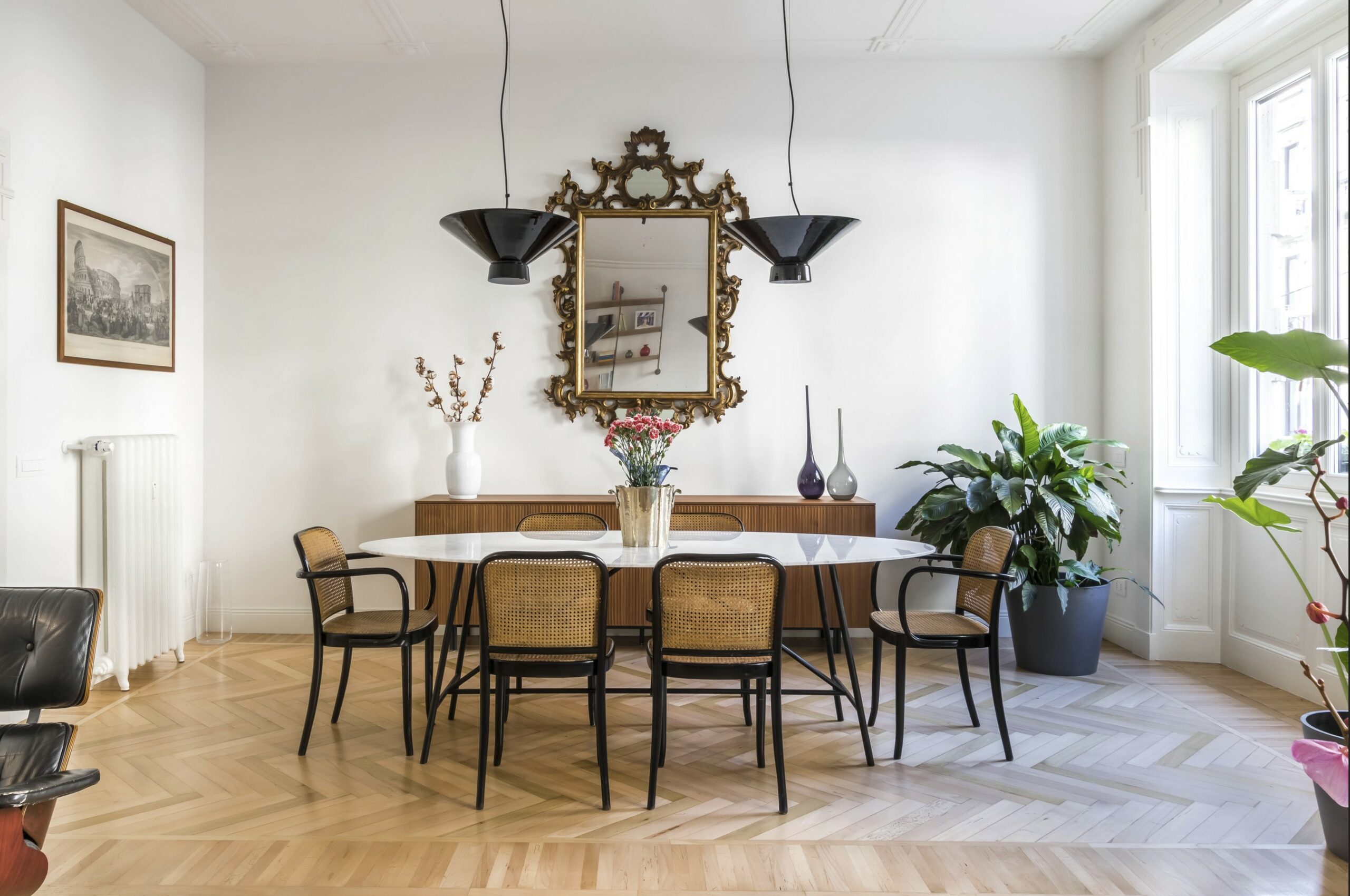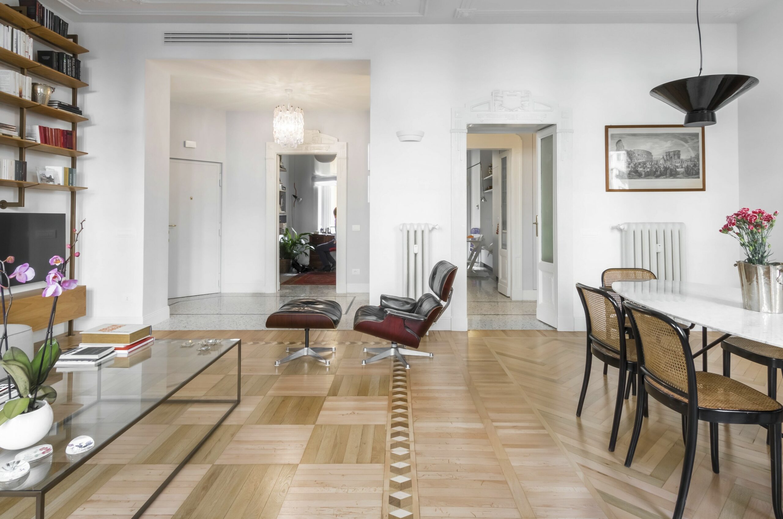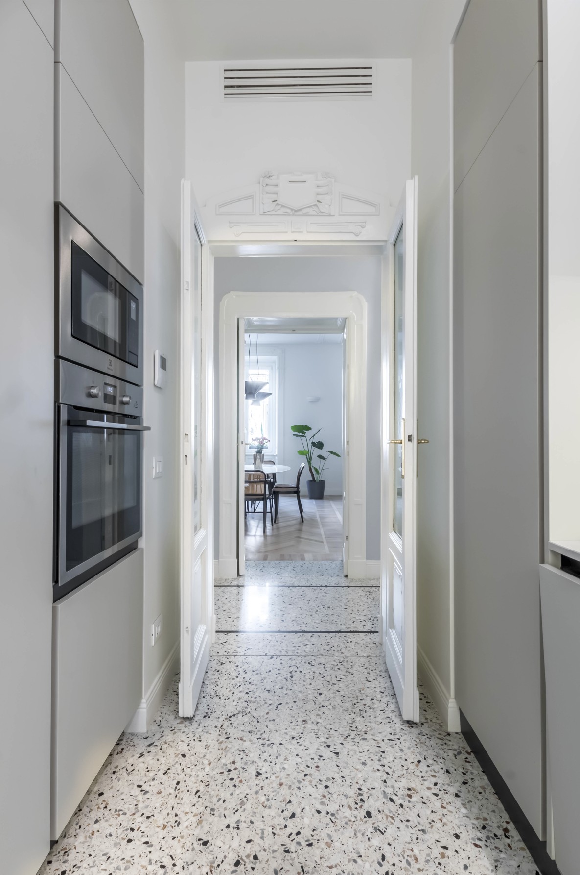 Un appartamento elegante e luminoso che unisce dettagli storici e gusto contemporaneo. Pavimenti a spina di pesce, boiserie e modanature dialogano con arredi di design e tocchi classici, creando spazi conviviali e raffinati. Bagno minimale in terrazzo alla veneziana e zona notte intima con toni verde polvere completano un progetto armonioso e funzionale.