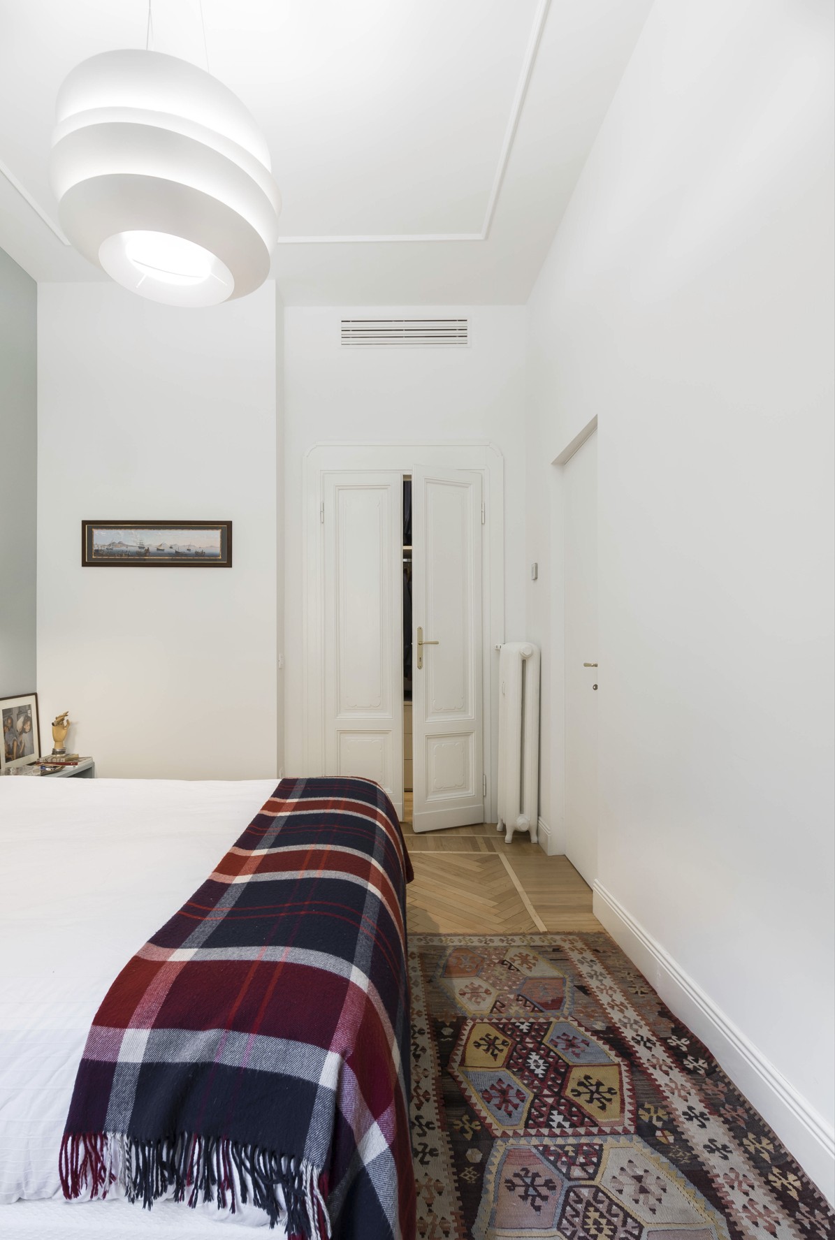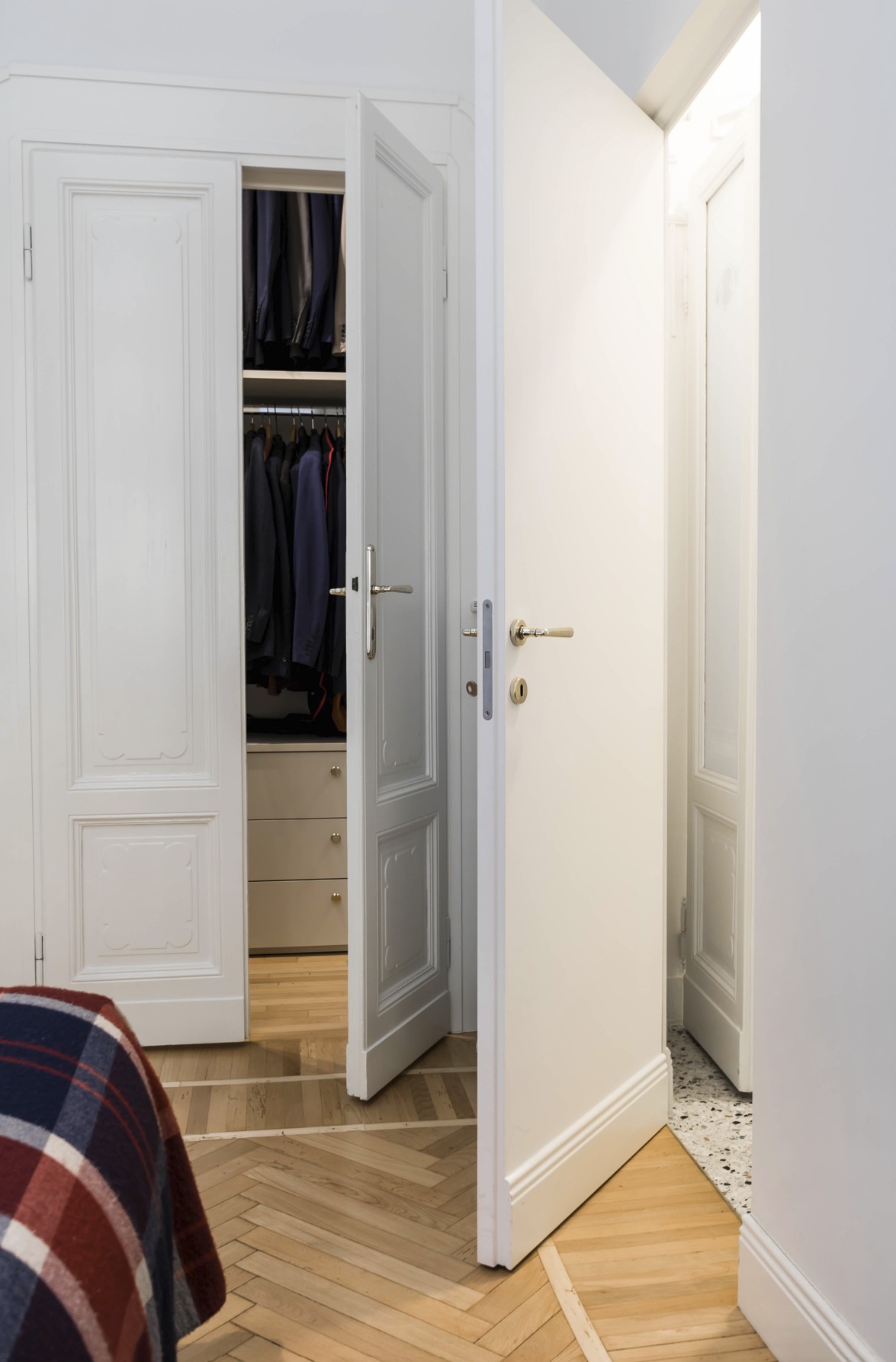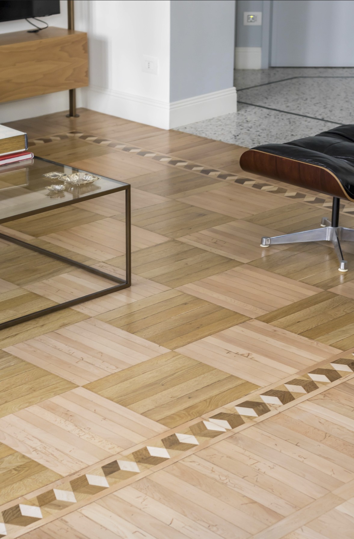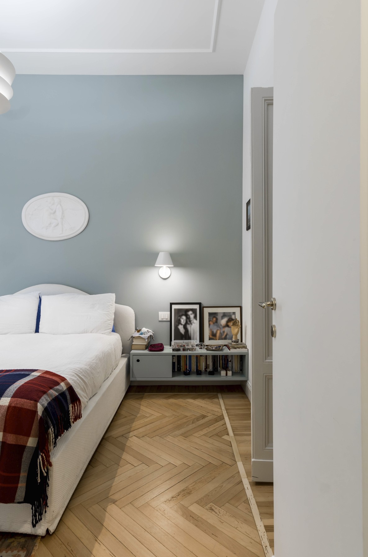 Un appartamento elegante e luminoso che unisce dettagli storici e gusto contemporaneo. Pavimenti a spina di pesce, boiserie e modanature dialogano con arredi di design e tocchi classici, creando spazi conviviali e raffinati. Bagno minimale in terrazzo alla veneziana e zona notte intima con toni verde polvere completano un progetto armonioso e funzionale.