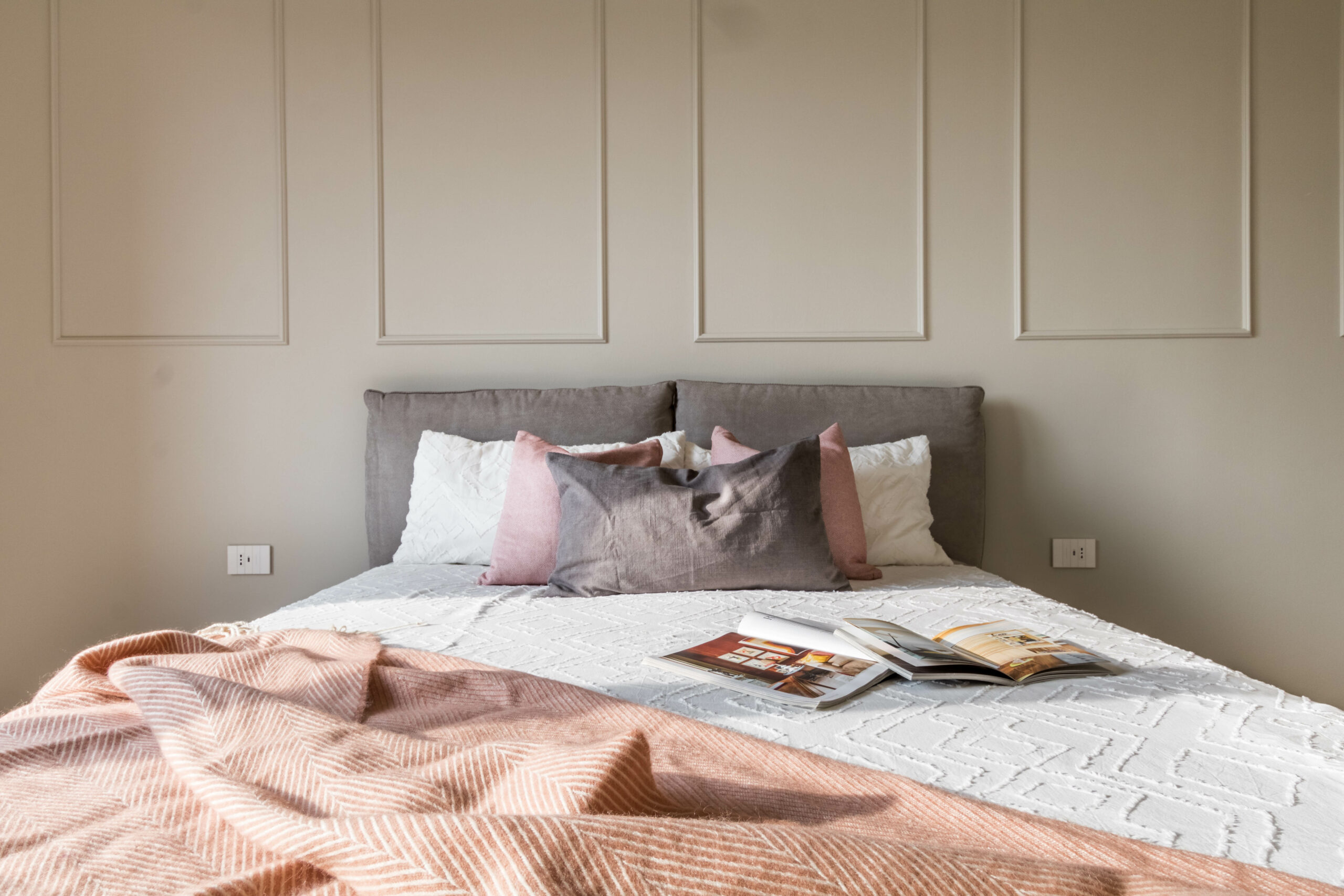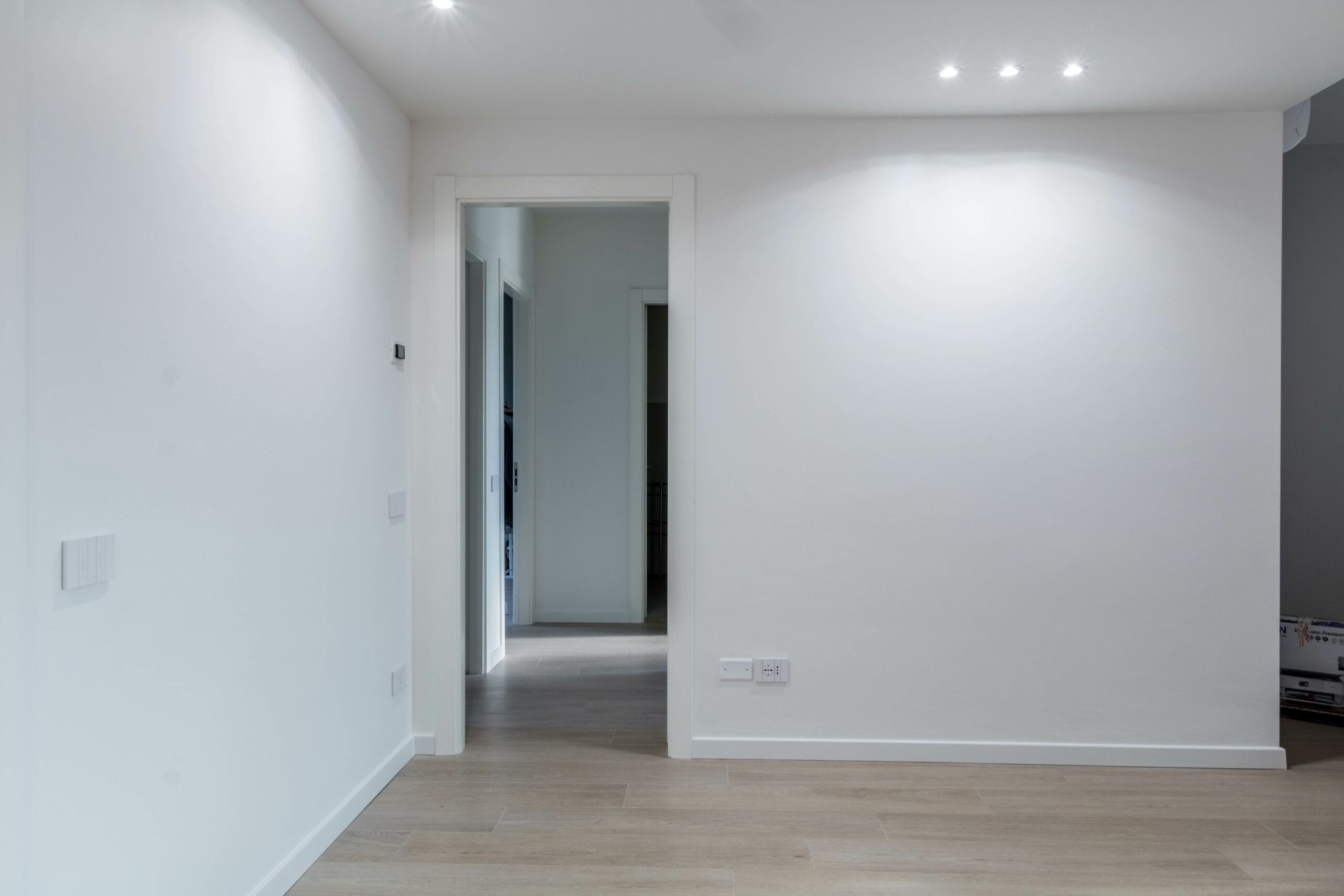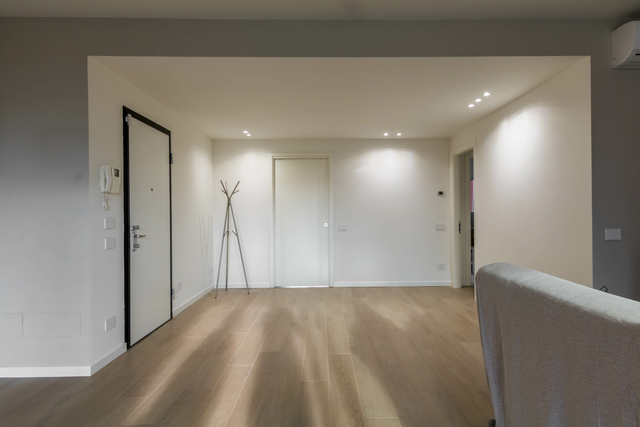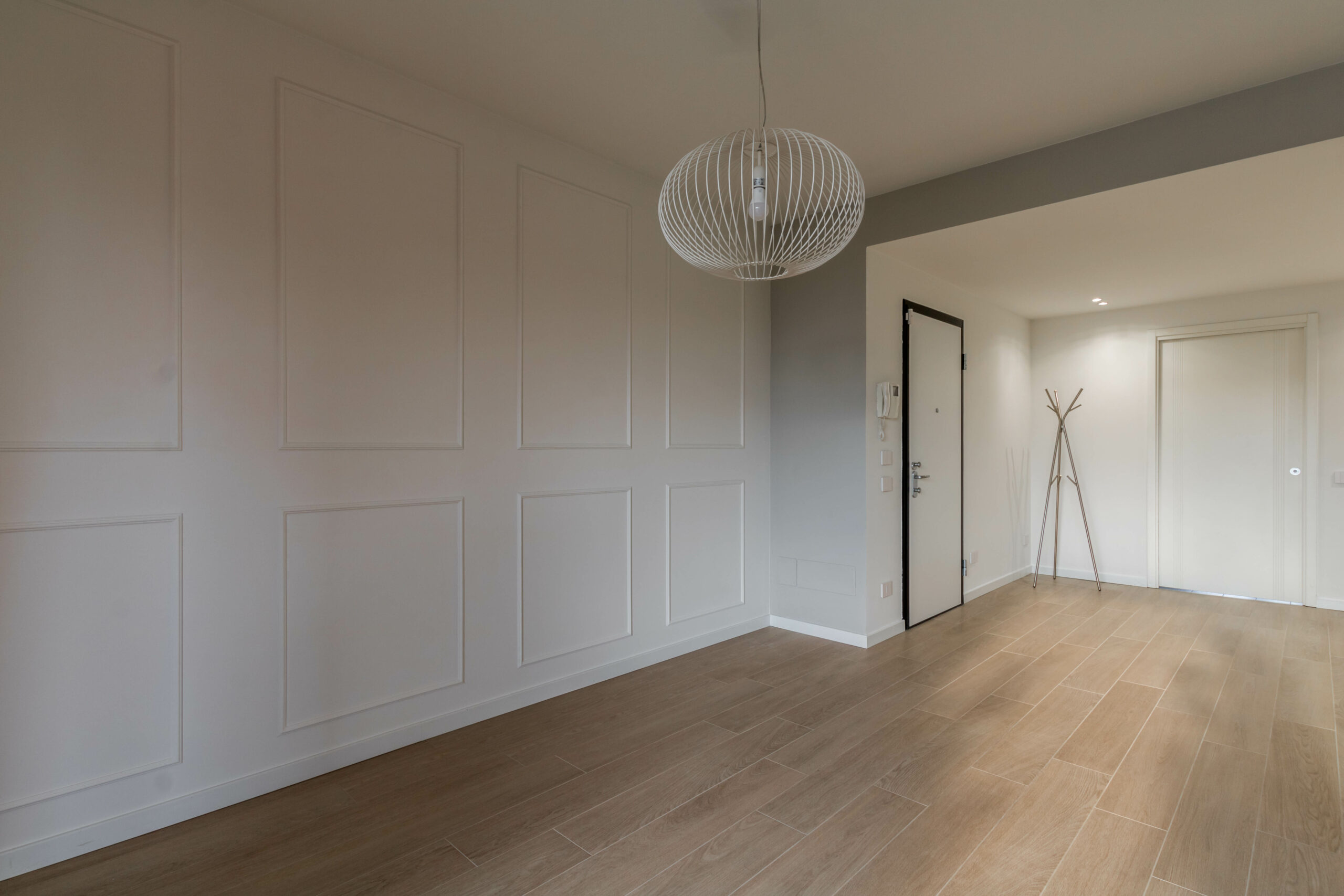 La ristrutturazione ha dato vita a spazi luminosi ed eleganti, caratterizzati da boiserie neutre, pavimenti in gres effetto legno e dettagli dal design essenziale. Nella zona notte prevalgono toni morbidi come grigio e cipria, mentre una parete verde salvia personalizza la camera secondaria. Il bagno unisce legno chiaro e rivestimenti sabbia per un effetto naturale e raffinato. Un progetto che coniuga sobrietà, calore e funzionalità contemporanea.